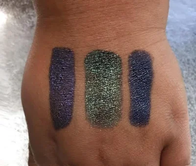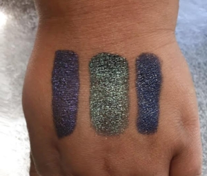 The color of the base plays a major role in how the shimmers stand out. The NYX Jumbo Eye Pencils in Black Bean + Milk have contrasting effects on the Moondust shadows. Milk (white) gave the shadows a grayish base and really let the sparkles stand out with direct light on it. The black base intensified everything! The base of the shadow became more pronounced. The shimmers were singing! The reddish copper shade is from the Eyedeal Duo from Dose of Colors in Maple. It gave a different tone to the shadows. The Intergalatic shadow (lighter purple) looked like it was on fire.